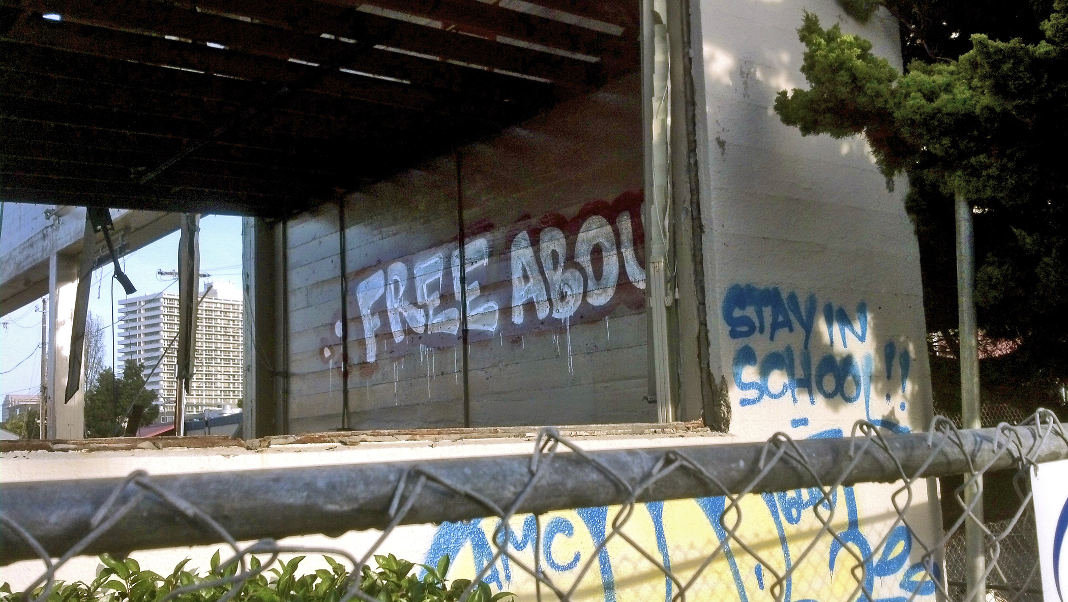Irony: Stay in School Sprayed on the shell of a toxic school site, the “stay in school” cliché is given an amusing twist. (Irony: Stay in School. Edward Cervantes, Oakland Voices 2012)