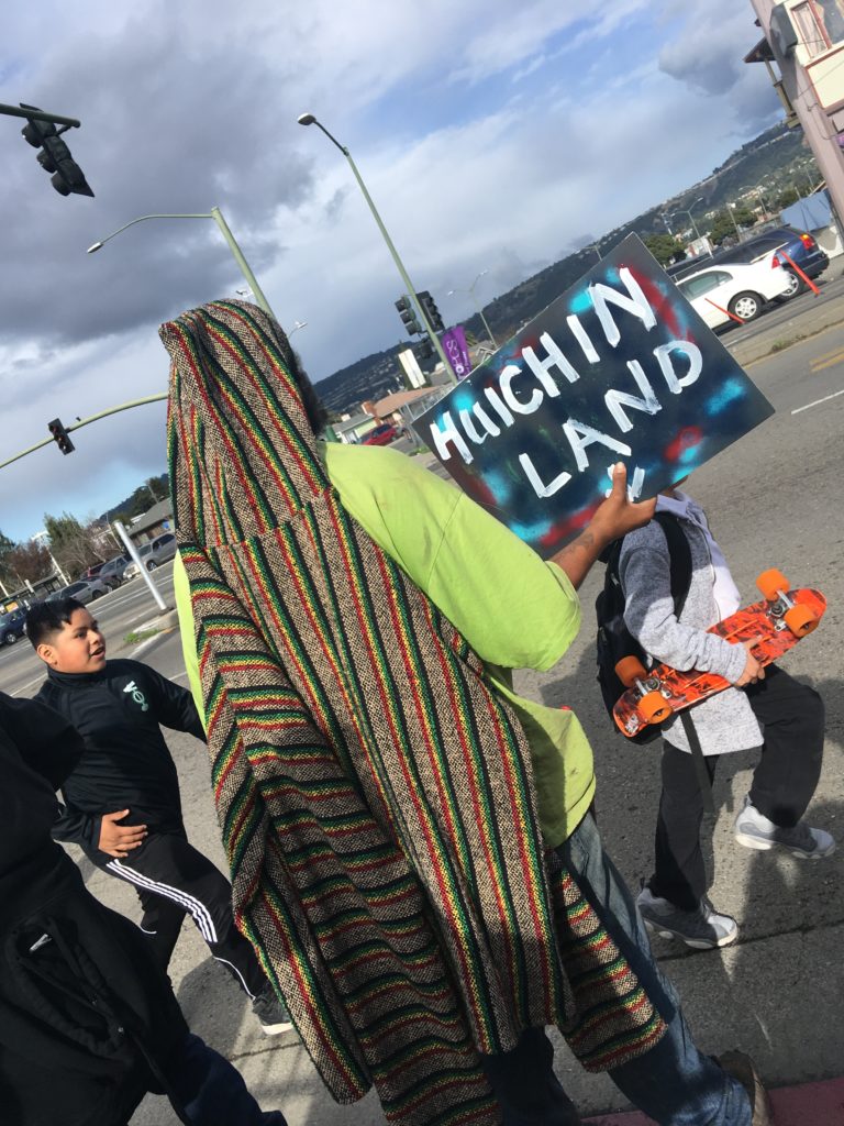 Off we went with our signs, our medicines and our prayers. Within a few blocks we passed a cedar tree (our belief is that cedar is a healing tree as it turns negativity into positivity); we all expressed gratitude as we grasped some branches and kept moving. By the time we reached 105th and E. 14th St/International Blvd, I felt a shift within myself. I had been feeling sad about missing my ancestral homeland when this ancestral homeland was finally starting to come home to its original people. And I got to be there, I got to see that light come through. I realized in that moment that I am here in this moment to honor this land along with all of us who were there. And when I honor this precious land, I honor my own ancestors and by extension bring honor to the ancestors of this land.
