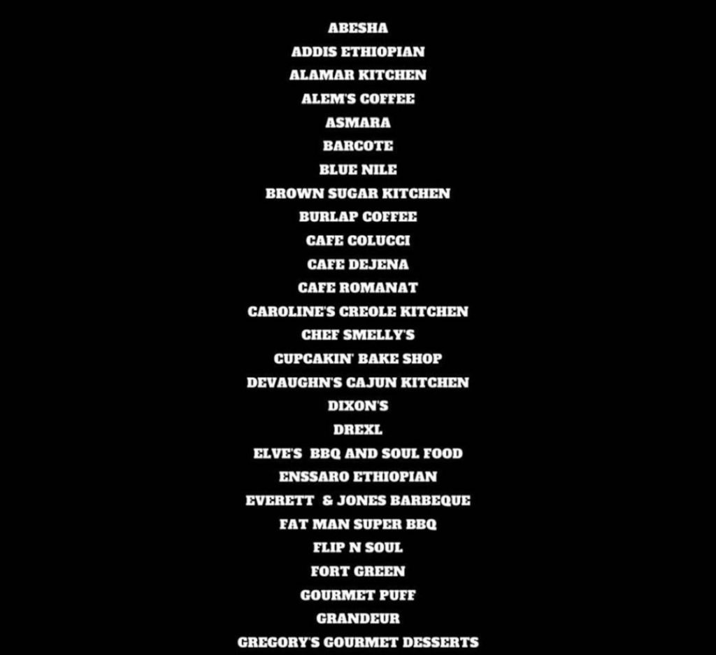 Abesha, Addis Ethiopian, Alamar Kitchen, Alem’s Coffee, Asmara, Barcote, Blue Nile, Brown Sugar Kitchen, Burlap Coffee, Cafe Colucci, Cafe Dejena, Cafe Romanat, Caroline’s Creole Kitchen, Chef Smelly’s, Cupcakin’ Bake Shop, Devaughn’s Cajun Kitchen, Dixon’s, Drexl, Elve’s BBQ and Soul Food, Ensarro Ethiopian, Everett & Jones Barbecue, Fat Man Super BBQ, Flip N Soul, Fort Green, Gourmet Puff, Grandeur, Gregory’s Gourmet Desserts, Home of Chicken and Waffles, Horn BBQ, Hot Dog Co., It’s All Good Bakery, James and the Giant Cupcake, Jusla Eats, Kefa Coffeee, Kingston 11 Cuisine, Kopia Delices, Lane-E Kefa Coffee, Lena’s Soul Food Cafe, Little Giant Ice Cream, Lois the Pie Queen, Malibu’s Burgers, Mela Bistro, Messob Ethiopian Restaurant, Mexiq, Mi Granny’s Kitchen, Miliki, The Miranda, Miss Ollie’s, Monifa Dayo, Oeste, Red Bay Coffee, Red Sea, Reaschelle’s Cheesecakes, Roderick’s BBQ, Rush Bowls, Ruth’s Buka, Selam, Jusla Eats, Shewat, Smokin’ Woods BBQ, Sobre Mesa, Souley Vegan, Southern Cafe, Sugarsweet, Super Juiced, Teni East Kitchen, The Cook and Her Farmer, The Hatch, The Veg Hub, Uncle Willie’s Original BBQ and Fish, Vegan Mob, Suya African Grill.