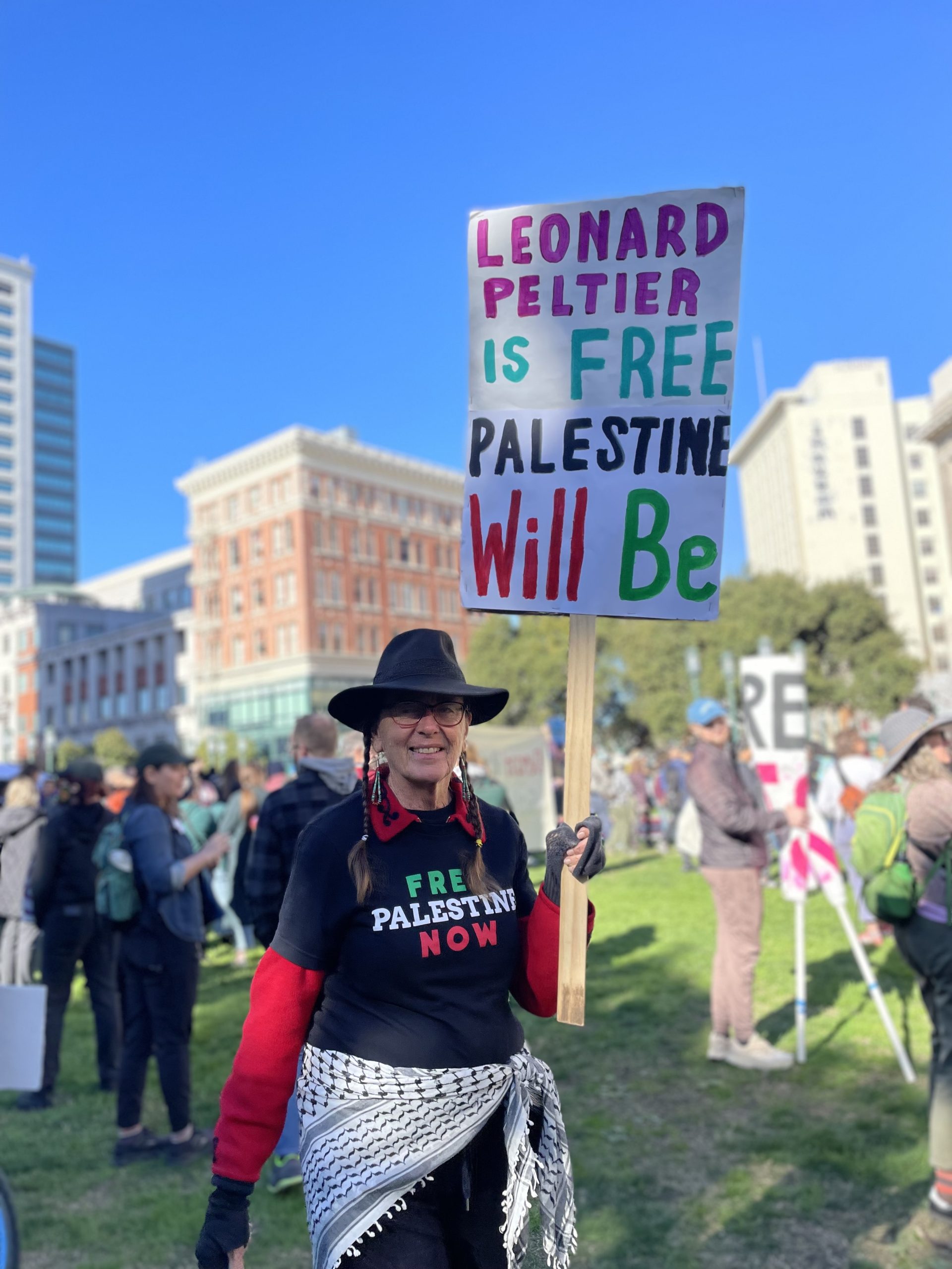 solidarity-sign Demonstrator with a solidarity sign connecting freedom of political prisoner Leonard Peltier and Palestine. Photo: Patricia Contreras-Flores.