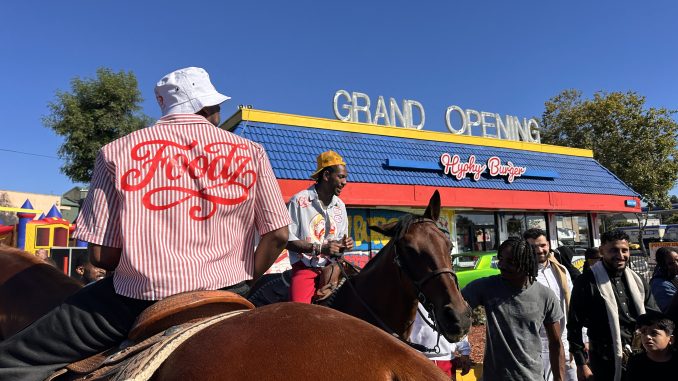 Two horses, two candy-painted Mustangs, a bounce house, and a yellow bus. After a soft launch in February, Hyphy Burger’s grand opening took place in West Oakland on August 2.
