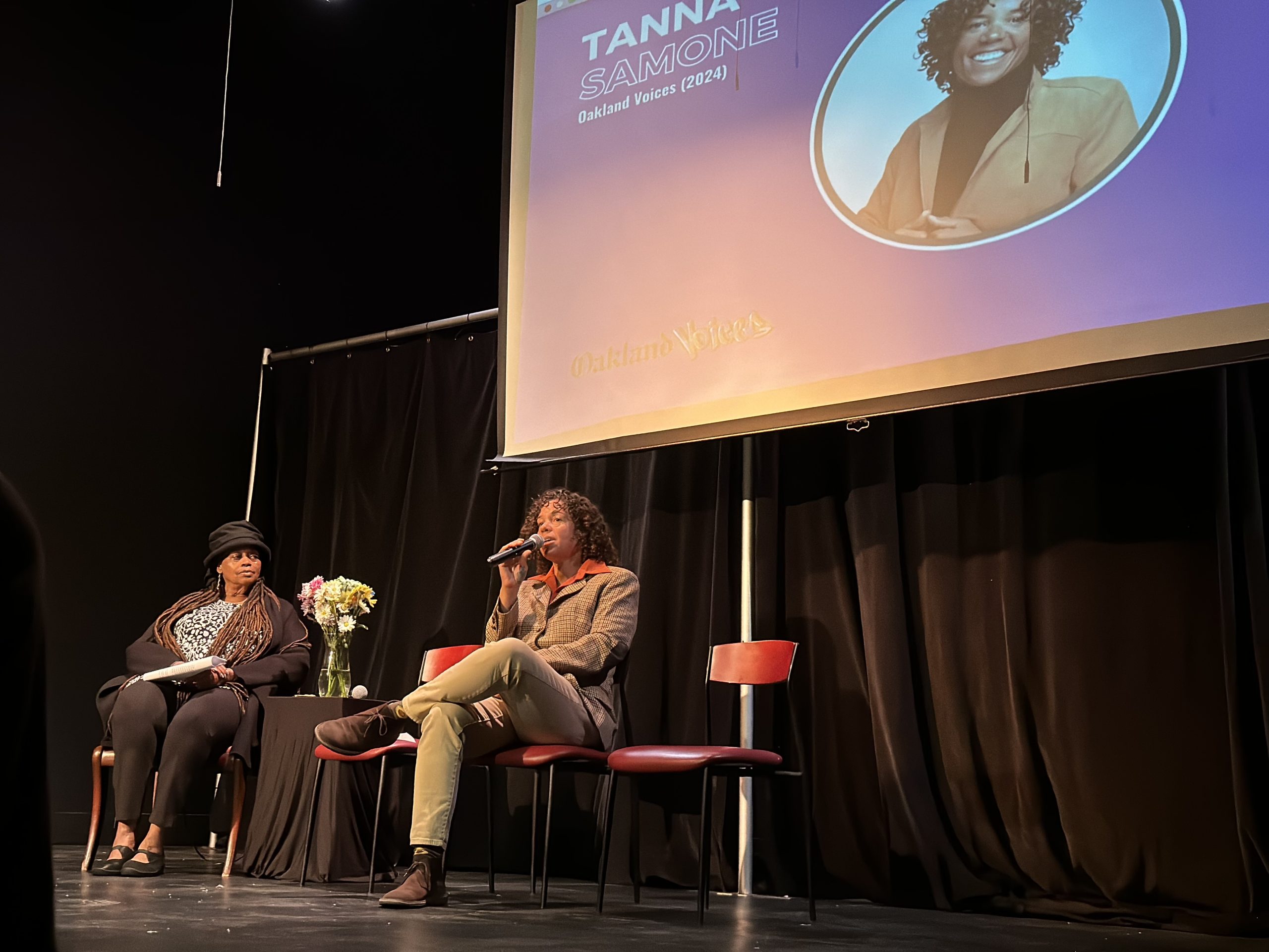 Tanna Samone speaks at Seen & Heard, held Oct. 25 at BAM House in Oakland. Photo by Amani Hamed for the Maynard Institute.