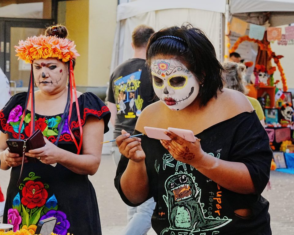Skeletal figures known as “calacas,” sometimes in fancy dress, also appear in the altars. Some participants dressed up as skeletons and made their faces with half or full skulls to represent the closeness of mortality and the social equality of death.