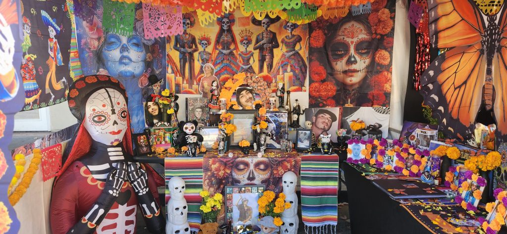 Ofrendas and costumes prominently displayed marigold flowers. The marigold was sacred to the Aztecs and is known as cempasúchil, “the flower of 400 lives.” Many of the altars included papel picado, decorated paper cutouts.