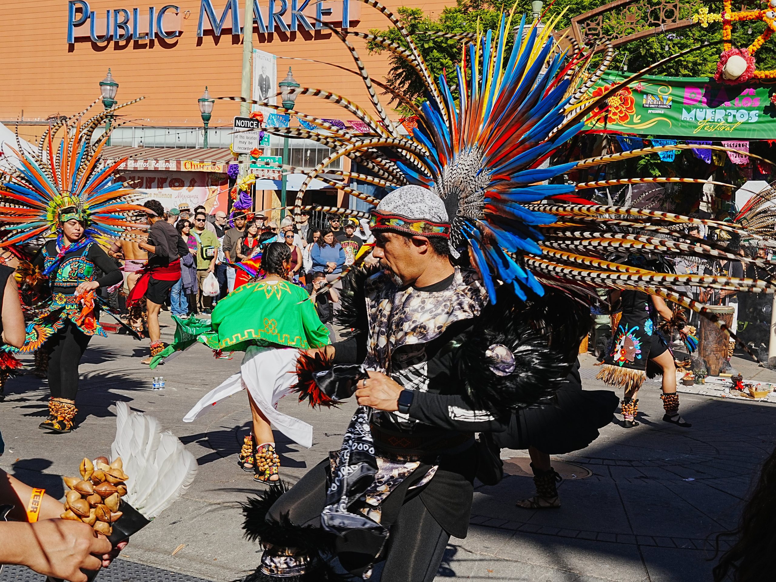6-Aztec-dancers-HD Aztec dancers twirl on 12th St near Fruitvale Plaza during the opening ceremony of Oakland’s Dia de los Muertes festival on Nov. 2. Photo by Howard Dyckoff