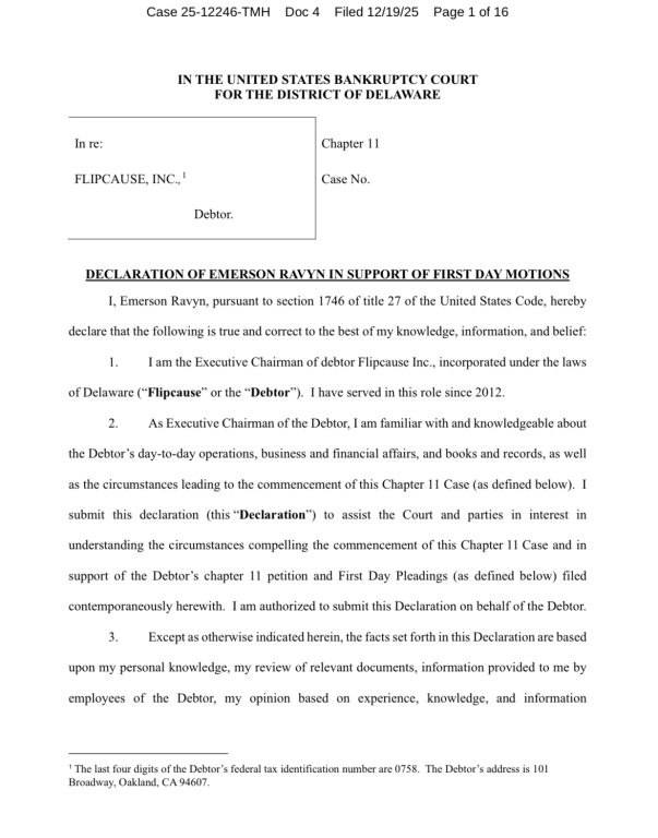 Case: Flipcause Inc., 25-12246, in US Bankruptcy Court for the District of Delaware.