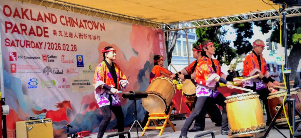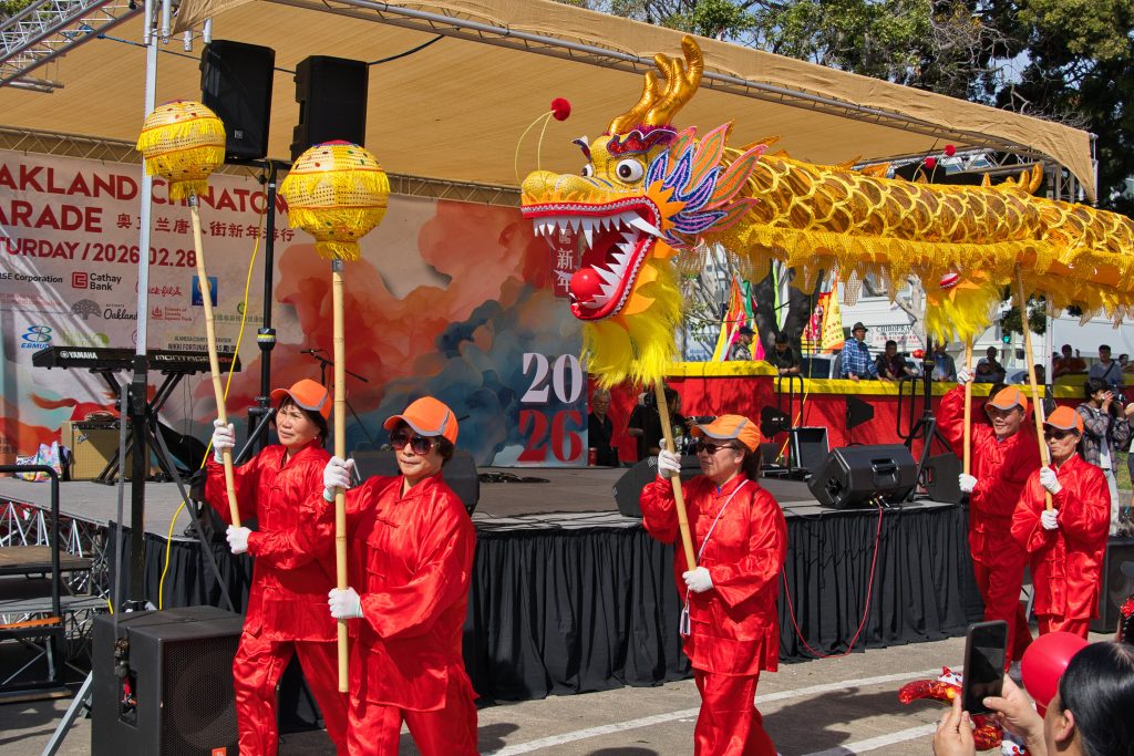 More photos by Howard Dyckoff.Dragon Parade by members of the ToiShan Benevolent Association at Wilma Chan Park, Photo: Howard Dyckoff/Oakland Voices. Lion Dancers and percussionists preceded the Dragon Dancers in the Oakland Chinatown Lunar New Year Parade on Feb. 28. Photo: Howard Dyckoff/Oakland Voices. Master Shubai Zhu performed a Tai Chi demonstration on stage during the Oakland Chinatown Lunar New Year Parade festival on Feb. 28. Photo by Howard DyckoffFlag bearers stood at the start of the Oakland Chinatown Lunar New Year Parade on Feb. 28 at Wilma Chan Park.Dragon dance lead “Uncle Le” held the dragon’s head at the Oakland Chinatown Lunar New Year Parade on Feb. 28. Photo: Howard Dyckoff/Oakland Voices.The “Fire Horse” float appeared in the Oakland Chinatown Lunar New Year Parade on Feb. 28, celebrating the Year of the Horse. This event is a once in a 60-year occurrence and signifies energy and speedy change. Photo: Howard Dyckoff/Oakland Voices.A crowd gathered on 9th and Jackson St to await the start of the Oakland Chinatown Lunar New Year Parade on Feb. 28. Photo: Howard Dyckoff/Oakland Voices.The OCIC 2026 board posed for a photo on stage at the Oakland Chinatown Lunar New Year Parade festival on Feb. 28. Top: Tony Trinh, Jabari Jourdan-Ali, Josephine Hui, Hal Gin, Joe Ma, Stewart Chen, Alfred Lee, Douglas Tam, Sharon Lai, Kenneth Tang, Michael Yim, Sky Liang. Bottom: Jet Liu, Douglas Wong, Elaine Peng. Photo by Howard Dyckoff.Oakland Chinatown Improvement Council members Albert Lee, Arthur Liu (father of Alyssa Liu), Jabari Jourdan-Ali, and Dong Shu carried a banner in the Oakland Chinatown Lunar New Year Parade on Feb. 28. Photo by Howard Dyckoff.Kadence and Emory Yim hosted the Oakland Chinatown Lunar New Year Parade festival on Feb. 28. Photo: Howard Dyckoff/Oakland Voices.Angela Wu joined the Oakland Chinatown Lunar New Year Parade on Feb. 28, dressed as a traditional Royal. Photo: Howard Dyckoff/Oakland Voices.Arthur Liu, Mayor Barbara Lee, and Dr. Stewart Chen atop a float during the Oakland Chinatown Lunar New Year Parade on Feb. 28. Congresswoman Lateefah Simon and Supervisor Nikki Fortunato Bas also pictured. Arthur Liu attended in place of his daughter, Olympian Alyssa Liu. Photo by Howard DyckoffThe East Bay chapter of the UN Association participated in the Oakland Chinatown Lunar New Year Parade festival on Feb. 28, including board members Sandra Williams and Melinda Howard Herrarte. Photo: Howard Dyckoff/Oakland Voices.Oakland Taiko provided traditional drumming for the Oakland Chinatown Lunar New Year Parade festival on Feb. 28. Photo: Howard Dyckoff/Oakland Voices.