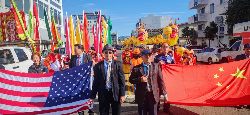 Members of the ToiShan Benevolent Association led the Dragon Parade at the start of the Oakland Chinatown Lunar New Year Parade on Feb. 28, beginning at Wilma Chan Park. Photo: Howard Dyckoff/Oakland Voices.